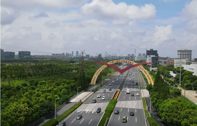 这是位于上海外高桥保税区的中国(上海)自由贸易试验区的标志“海鸥门”(2023年8月1日摄,无人机照片)。新华社记者 方喆 摄