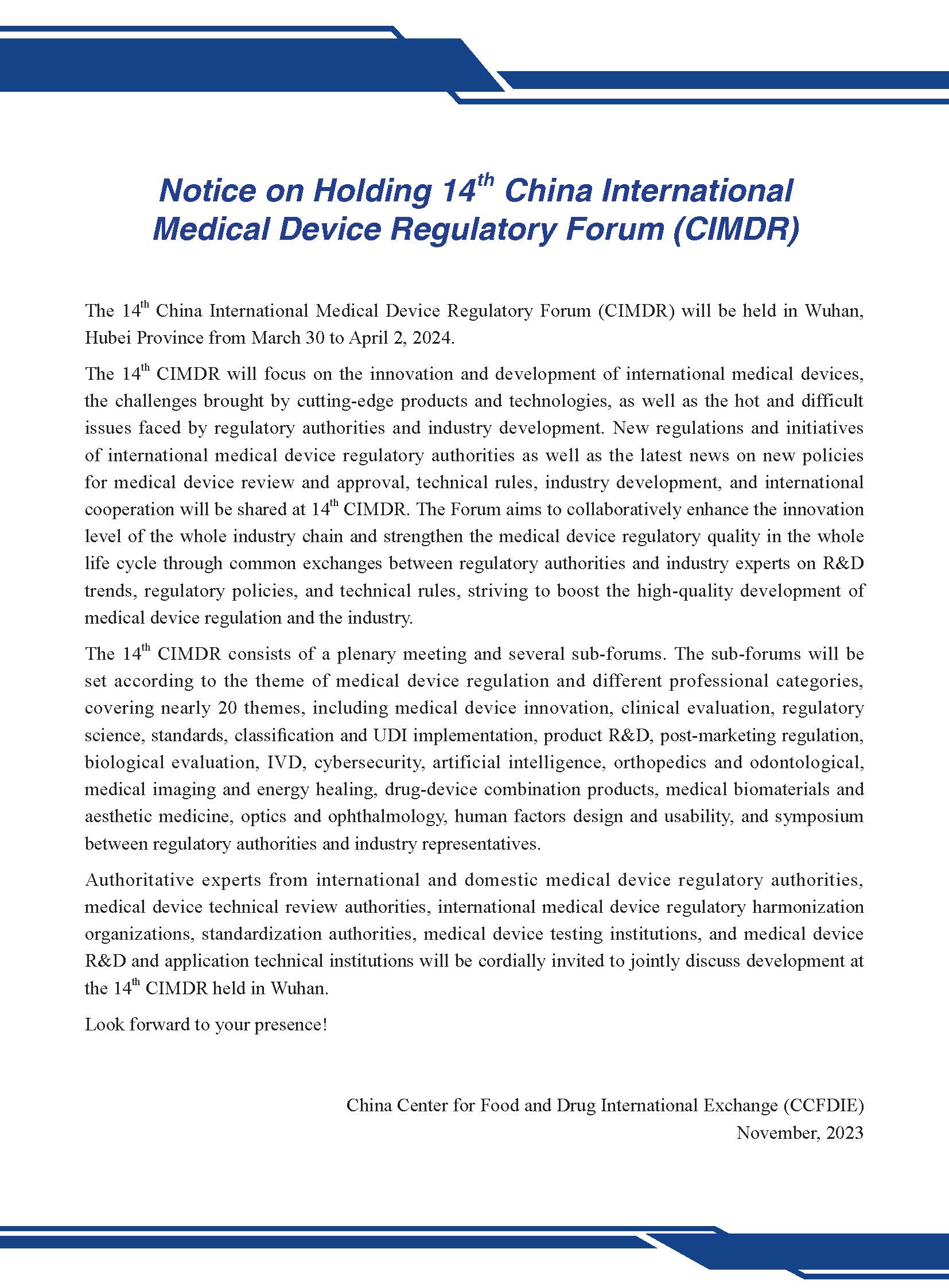 14th China International Medical Device Regulatory Forum Notification(First Roound)